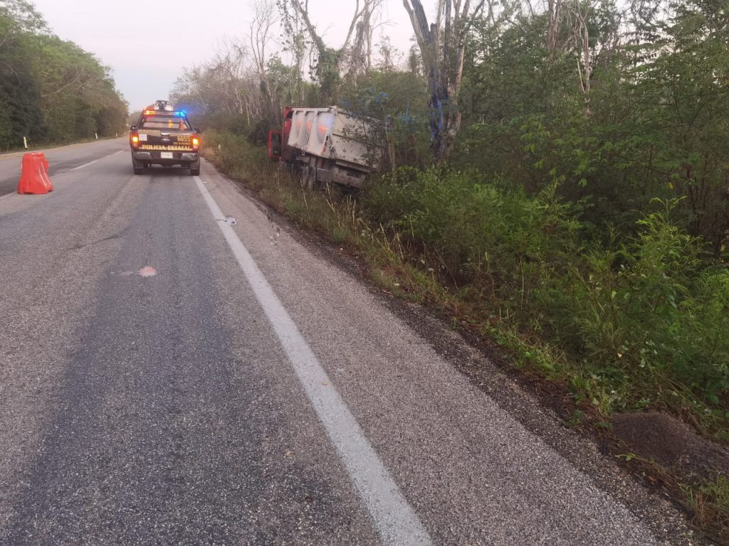 Camión de carga se sale del camino en la carretera a Cancún.