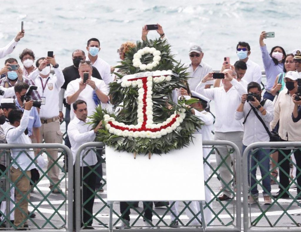-A bordo del buque insignia “Veracruz”, Vila Dosal depositó una ofrenda floral en alta mar en honor a los marinos caídos en el cumplimiento de su deber y entregó reconocimientos a personas destacadas del sector marítimo y portuario.