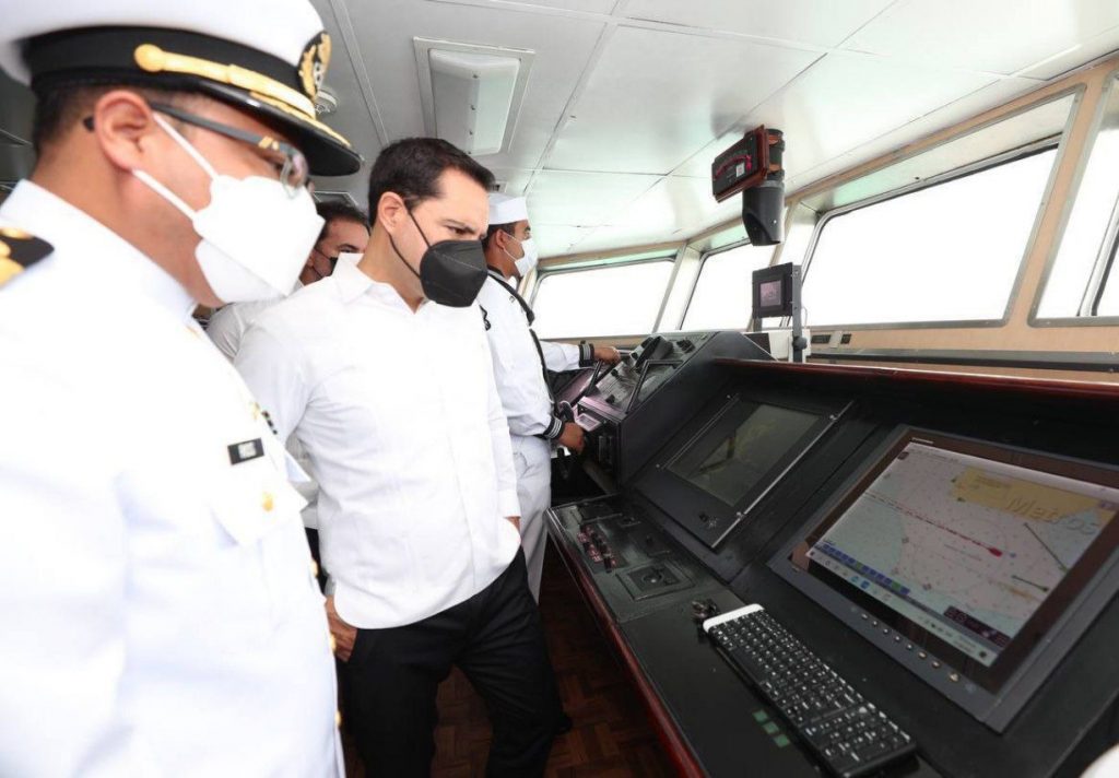Momentos antes, acompañado del Capitán de Fragata, segundo Comandante del buque Veracruz P154, Edgar Javier Vilchis Bravo, el Gobernador realizó un recorrido por el Centro de Información y Combate (CyC), que es desde donde se proporciona información acerca del espacio de batalla cercano o área de operaciones; después, en la Cámara de Capitanes y Oficiales, Vila Dosal recibió del Comandante de la IX Zona Naval, un certificado de Singladura por navegar un buque de la Armada de México y realizó la firma del libro de visitantes distinguidos.