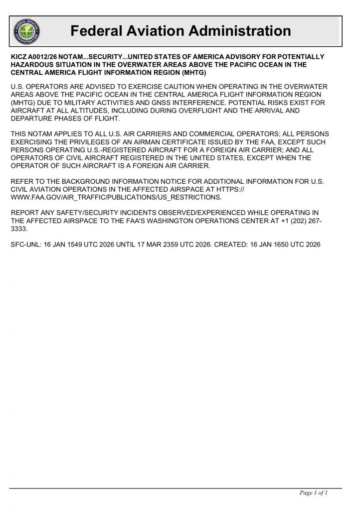 La Administración Federal de Aviación de Estados Unidos (FAA) pidió «tener precaución» en el espacio aéreo de México y países del sur por actividades militares a efectuarse, así como por la interferencia de los sistemas de navegación, de acuerdo con información de Reuters.