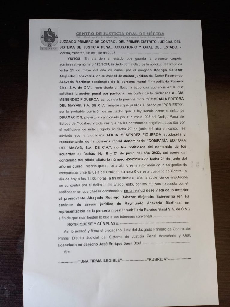 En la sala 6 del Centro de Justicia Oral de Mérida (Cejom) estaba programada para hoy, a las 11 horas, la audiencia con la directora de Por Esto!, Alicia Menéndez Figueroa, por el delito de difamación que hay en su contra, de acuerdo con la denuncia interpuesta por los empresarios de Paraíso Sisal, pero minutos antes, al representante jurídico de Paraíso Sisal, Rodrigo Baltazar Alejandre Echeverría, se le avisó la cancelación del evento.