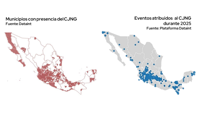 Se recomienda prestar particular atención a cualquiera de los 727 municipios donde opera el CJNG que representan más del 30 % del territorio mexicano, mismos que se concentran principalmente en el Occidente, Centro, Golfo de México, Sureste y en la península de Baja California como se observa en los siguientes mapas de presencia territorial (rojo) y eventos disruptivos adjudicados al CJNG durante 2025 (azul) detectados por la plataforma de inteligencia de Dataint .