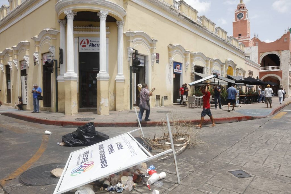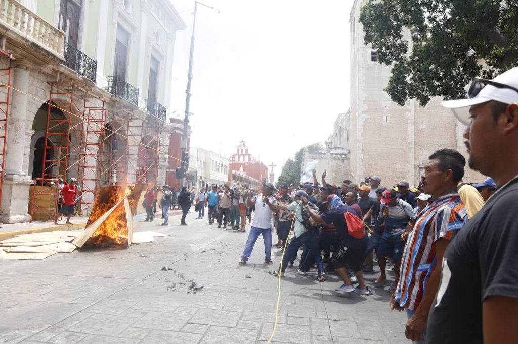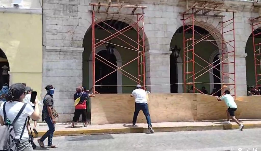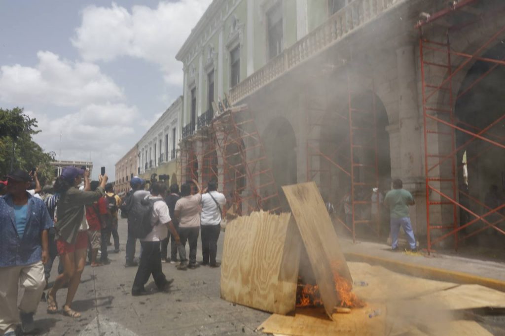 Con violencia aventaron bolsas, fierros y lo que encontraba a su paso para cerrar el tránsito del primer cuadro de la ciudad. Posteriormente, enardecidos quitaron las tablas y los andamios que se encuentran en Palacio de Gobierno, los cuales están siendo usados para remozar el edificio, mismos que fueron aventados con violencia y luego les prendieron fuego, afectando a los comercios de la zona, así como intimidando a las personas que transitan por la plaza grande de Mérida.
