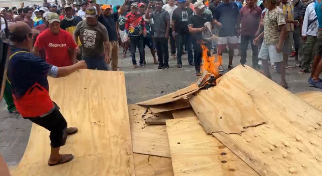 Mérida, Yuc., 18 de agosto de 2023.- Pescadores de Sisal, Hunucmá y Tetiz dañaron infraestructura urbana y vandalizaron la sede del Poder Ejecutivo, pese a ser atendidos por funcionarios del Gobierno del Estado, ante el reclamo que tienen por pagos de indemnización debido a las afectaciones que causó un barco al Arrecife Madagascar ubicado en ese puerto, tema que es netamente competencia del Gobierno federal.