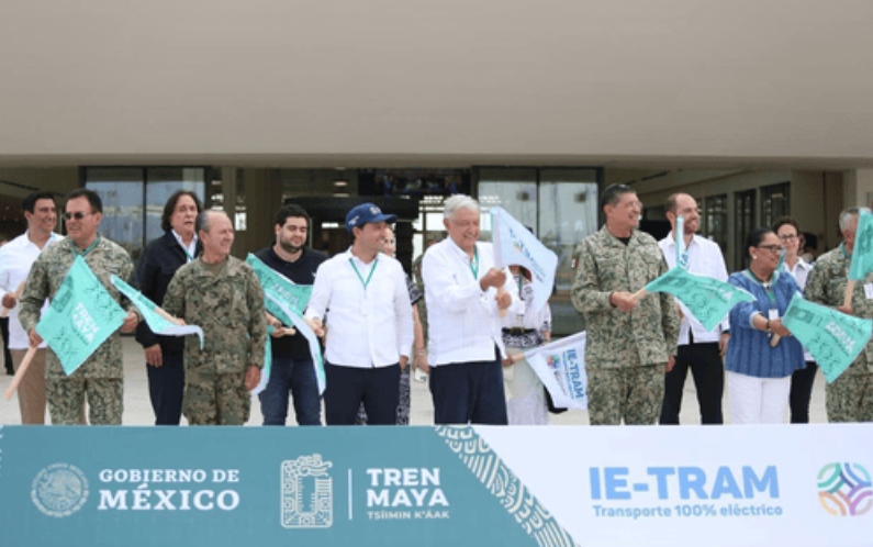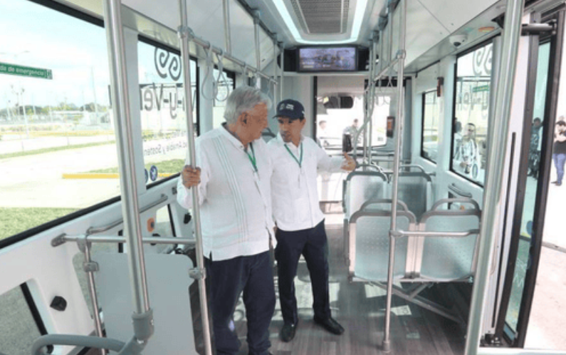 -Vila Dosal y López Obrador se subieron a una de las 11 unidades del Ie-tram que ya se encuentran en Yucatán, donde constataron la alta tecnología que se utiliza en este transporte que es el primero 100% eléctrico en el Sureste y único en su tipo en Latinoamérica.