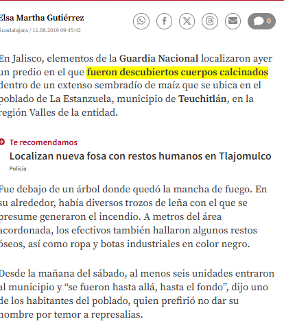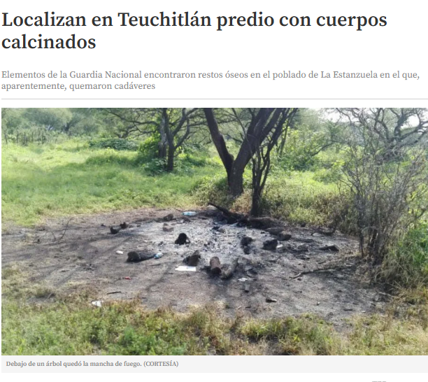 En cuanto al tema de del hallazgo un sitio donde incineraban cuerpos hallado en agosto del 2019, la nota fue publicada por Milenio Noticias.
