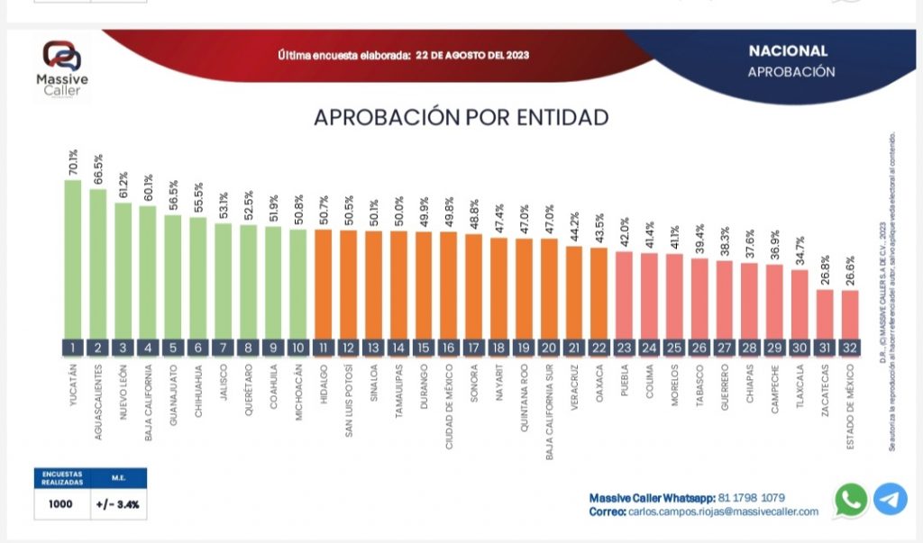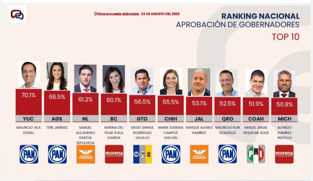 Al mandatario yucateco le siguen la gobernadora de Aguascalientes, Tere Jiménez, con 66.5%; y el gobernador de Nuevo León, Samuel García, con 61.2% de aprobación.